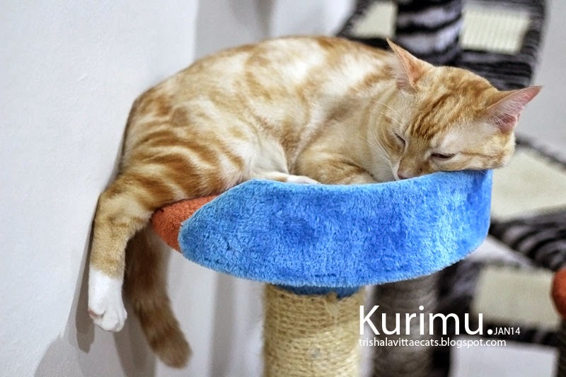Kusky was again camouflaging himself on his favorite cat tree, while Kurimu took the second tree on the left. Kuksy curled himself up until the tail touched the head. Cute!